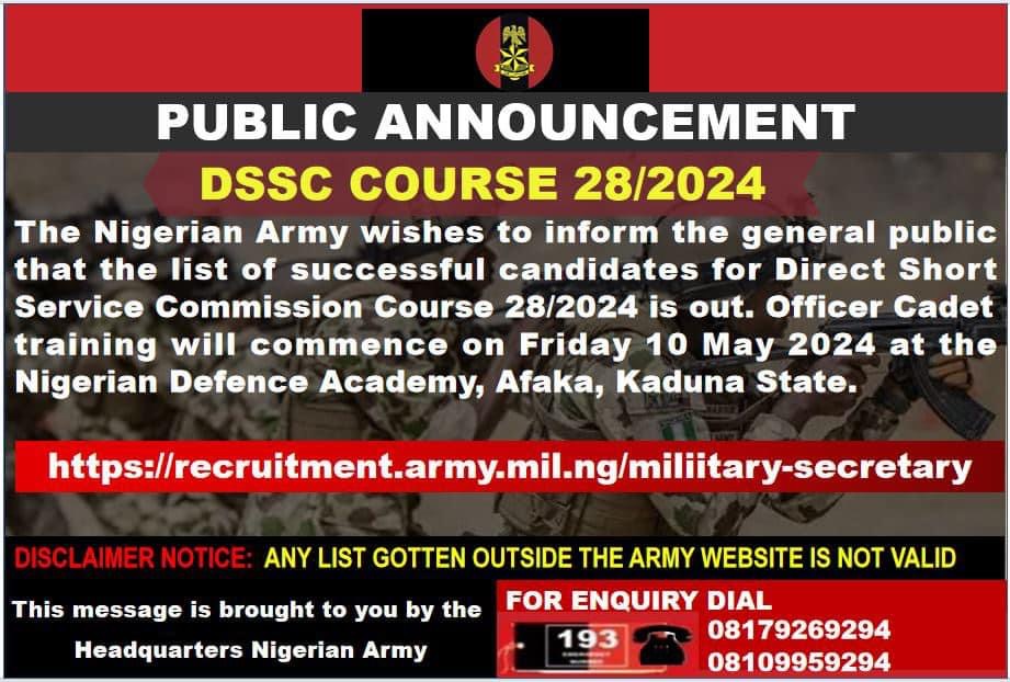 Nigerian Army Releases List Of Successful Candidates For DSSC Course 28/2024