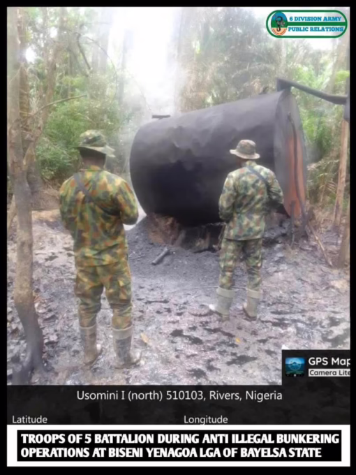 Likewise, in Bayelsa State, around Biseni in Yenagoa LGA, troops uncovered two illegal refining sites and three dugout pits containing over 7,000 litres of stolen products, which were appropriately destroyed. At Okordia in Yenagoa LGA, a Toyota Camry with registration number ASB 71 BG, loaded with over 600 litres of AGO, was intercepted.
