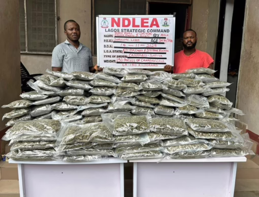Two suspects: Jamiu Kunle Kardoso and Oriyomi Waliu were on Friday 14th November arrested with 130 pouches of Canadian Loud weighing 65.150kg in Surulere area of Lagos, just as Taofeek Moraina was nabbed same day with 282 blocks of Ghana Loud with a gross weight of 141kg at Otto, Oyingbo area of Lagos.
